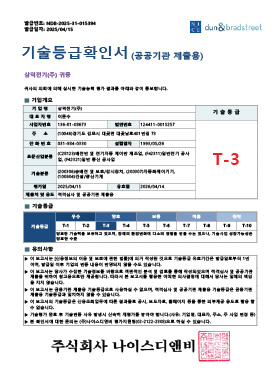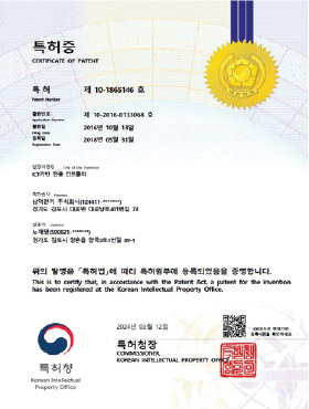 회사소개 인증현황 연혁 인증현황 연혁 인증현황 인증사항 성능인증서 (배전반) 성능인증서 (계장제어장치 / 프로세스제어반 / 빌딩자동제어장치) 단체 표준제품 인증서 품질인증(Q마크) 지정서 기술혁신 인증서 기업부설연구소 중소기업 확인서 기술등급(T-3) 확인서 전기공사업 정보통신공사업 ISO9001 ISO14001 지적재산권 사항 디자인등록 제 30-068946호 화상디자인이 표시된 컴퓨터 모니터 디자인등록 제 30-0706037호 배전반용 릴레이 패널 특허 제 10-2721372호 배전반용 내진장치 및 이를 포함하는 내진 배전반 특허 제 10-2628511호 불꽃, 유해가스 감지 및 데이터 수집장치를 구비한 수배전반 특허 제10-2590048호 현장 적응형 알고리즘을 활용한 화재예측 및 소화 기능을 갖는 제어시스템 특허 제 10-2076945호 지진에 의한 기울기 분석 및 기울기 자체 응급복구 기능을 갖는 내진형 수배전반 특허 제10-2219806호 스마트 배전반의 상황 인식방법 및 그 스마트 배전반 특허 제 10-2189670호 스마트배전반에서 센서 데이터스트림 처리방법 및 그 스마트 배전반 특허 제 10-1825716호 내진 서포트 특허 제10-1785946호 내진용 수배전반, 전동기제어반의 지지 구조 특허 제10-1865146호 ICT기반 전용 컨트롤러 특허 제10-1557983호 비접촉 적외선 온도 변화를 이용한 지능형 열화 감시 진단기능의 배전반 특허 제10-1449422호 스카다시스템에서 플랜트 자동복구 및 보안시스템 특허 제 10-1252529호 이중화를 지원하는 배전반용 보안시스템 특허 제 10-2826396호 수배전반용 내진장치 및 이를 포함하는 내진 배전반