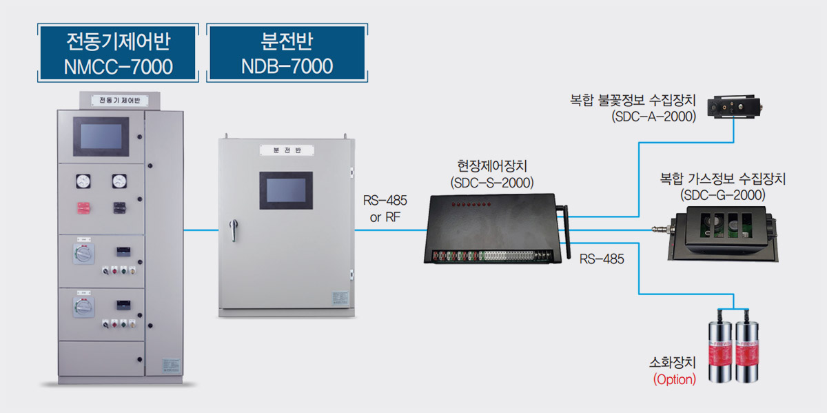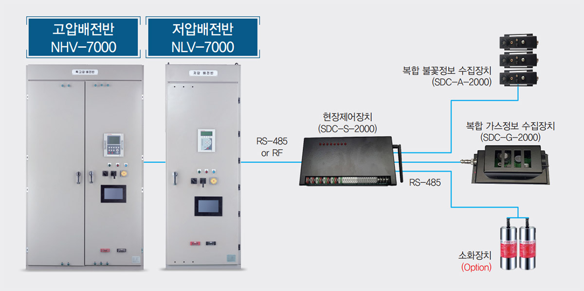 배전반에는 복합 불꽃정보 수집장치(SDC-A-2000)와 가스를 감지하는 복합 가스정보 수집장치 (SDC-G2000)로 데이터를 수집하여 화재 예측지표를 연산하는 안전진단제어기(SLAVE : SDC-G-2000)가 취부되고 화재 지표값에 따라 화재 판단시 소화장치를 구동하여 화재를 진압한다. RF 무선 또는 유선 (RS485) 통신으로 화재 지표 데이터를 안전진단감지기(MASTER : SDC-M-2000)로 제공하면 HMI 화면에 표시된다.
