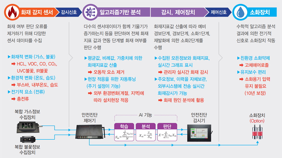 시스템 특징 - 분석 알고리즘의 화재예측 및 소화기능을 갖춘 재난안전수배전반